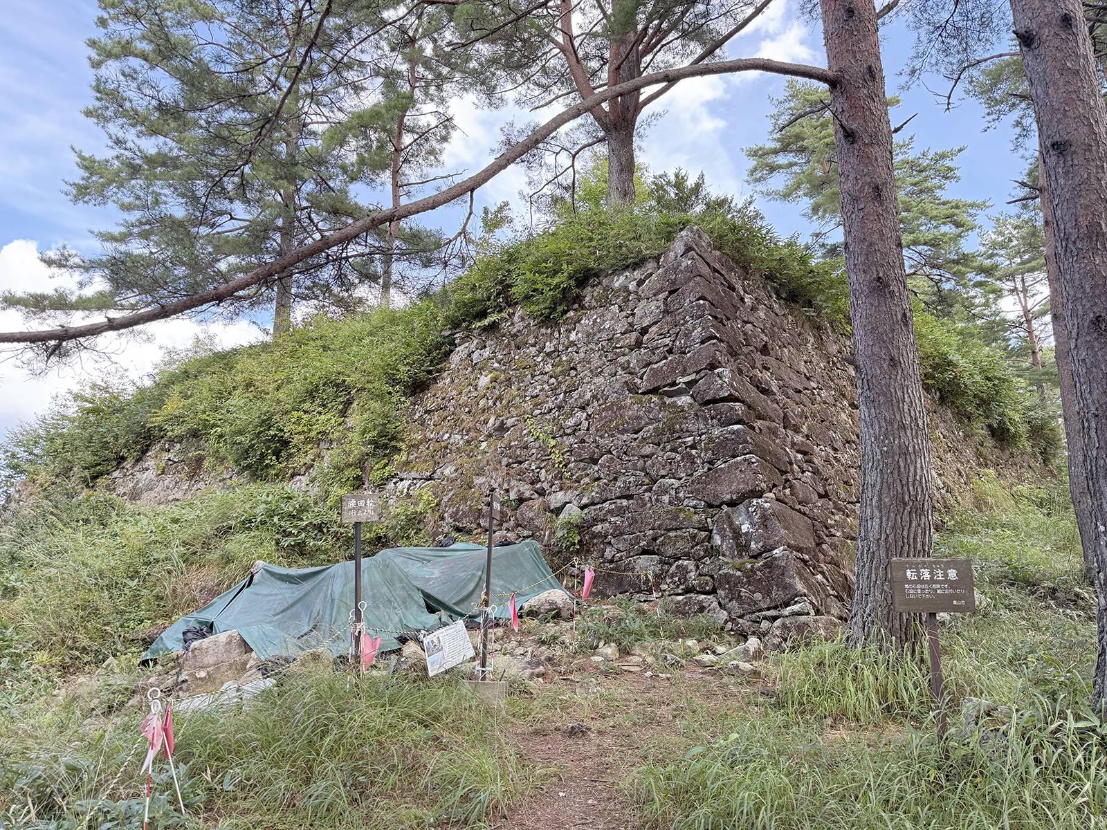 自綱は助命され、京都へ護送されて幽閉された。姉小路秀綱・季綱(すえつな)兄弟は松倉城に軍勢を集結させて、天嶮を活かした籠城戦により徹底抗戦を続けた。ところが、家臣の藤瀬新蔵(ふじせしんぞう)らが金森氏に内応して松倉城内に火を放ち、城兵が混乱する中、金森軍の総攻撃を受けて松倉城は陥落した。秀綱は城を脱出して信濃へ逃れたが、大根川で土民に襲われて鉄砲で撃ち殺されたという。『飛騨軍乱治国記』に「秀綱は信州え落行かんとて、大八賀より阿多野の中洞へ懸り、それより池ヶ洞之内黍生と言所にて、已に野人に討れん所を漸遁て、信州大根川の橋場迄逃延しかども、大根川の郷民の手に懸、鉄炮にて討殺す」とある。また『飛騨太平記』には「さて松倉は休庵(自綱)が二男秀綱楯籠る、され共終に守り遂げ得ず、城を落ち逃げ信州大根川の百姓の鉄炮に中(あた)り、むなしくなりぬ」とある。秀吉の書状には「一類悉首刎」とあるが、自綱は生存しているので秀吉一流の誇張表現である。天正15年(1587年)姉小路自綱は京都で没している。飛騨に侵攻した金森氏は、速やかに姉小路氏を滅ぼして国内を制圧したが、飛騨を治めることは想定していなかった。天正13年(1585年)9月3日付の金森長近から石徹白長澄(いとしろながずみ)宛の書状に「其国之儀、大野と相隔、殊上方ヘ出入不自由ニ候間、色々御理申上畏候、就夫堺廻ニて御知行給候」、「其国ヘハ稲葉勘右衛門方、先可被遣由被仰出候」などとある。これによると、飛騨国は越前国大野と離れており、上方との往来にも不便なので飛騨拝領を固辞し、代わりに和泉国堺の周辺に知行を得たとある。大野も引き続き知行が認められて安堵しており、飛騨国は稲葉勘右衛門重通(しげみち)が拝領となるので、飛騨に駐屯している金森家の軍勢が乱暴狼藉を働かないよう指示している。この史料から、金森長近は飛騨拝領を望んでいなかったことが分かる。しかし、結果的には長近が飛騨を任され、拠点を大野から移すことになる。天正13年(1585年)9月初頭から「国中一揆」という事態が発生しており、金森氏の一揆鎮圧は長期化した。金森氏に従った牢人衆が、姉小路氏滅亡後も旧領が回復されないことに不満を抱き蜂起したのである。天正14年(1586年)秀吉によって飛騨一国3万8千余石が改めて金森長近に与えられたが、この経緯を示す史料は見出せない。『願生寺由来』によると、金森長近は飛騨国拝領後、まず松倉城の破却を実施したという。松倉城破却の人足は、夜明け前から土や石をモッコ等で運ぶ作業に駆り出され、この作業は夏から冬まで長期間に渡った。高山城の築城は、天正16年(1588年)から慶長8年(1603年)まで16年間掛かった。城山の北の尾根を削って二之丸・三之丸を造成し、町屋は一番町・二番町・三番町の3町に編成して、松倉石ヶ谷から47軒を移転させるなど700余軒を移転させた。松倉城の破却は、高山城の築城と並行する動きとして実施されたようである。松倉城の石垣調査によると、二ノ丸は古い段階の石垣であり、年代的には天正13年(1585年)以前なので姉小路自綱が築いたとされる。一方、本丸と三ノ丸の石垣は新しく、天正14年(1586年)に入封した金森氏の在城期に改修されたものとされる。石垣の隅角部や鏡石の使用等をみると、さらに新しく天正期末頃から文禄期の特徴と捉えることもできる。このように松倉城の廃城年ははっきりしない。いずれにしても松倉城は、姉小路自綱の段階で稚拙ではあるが小石材で石垣の城を築いており、金森長近によって中心部が巨石の伴う高石垣に改修されるなど、新旧2時期に渡って構築されたものである。(2025.09.26)