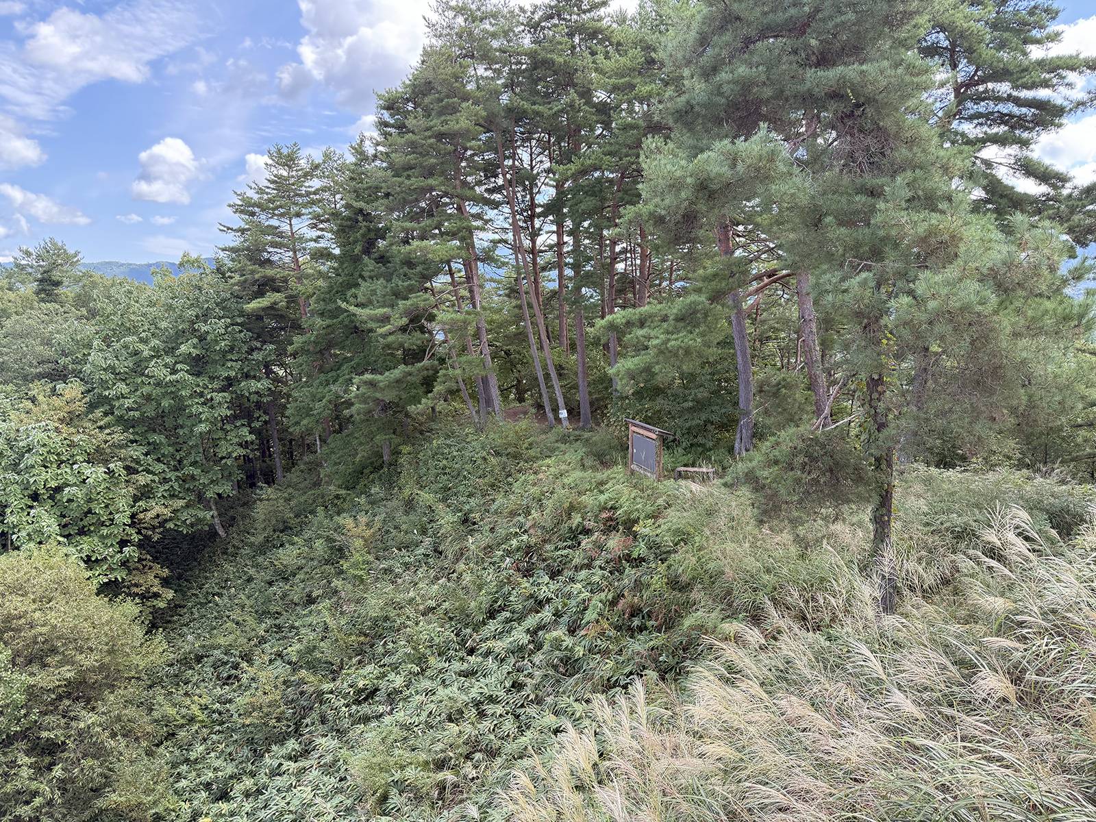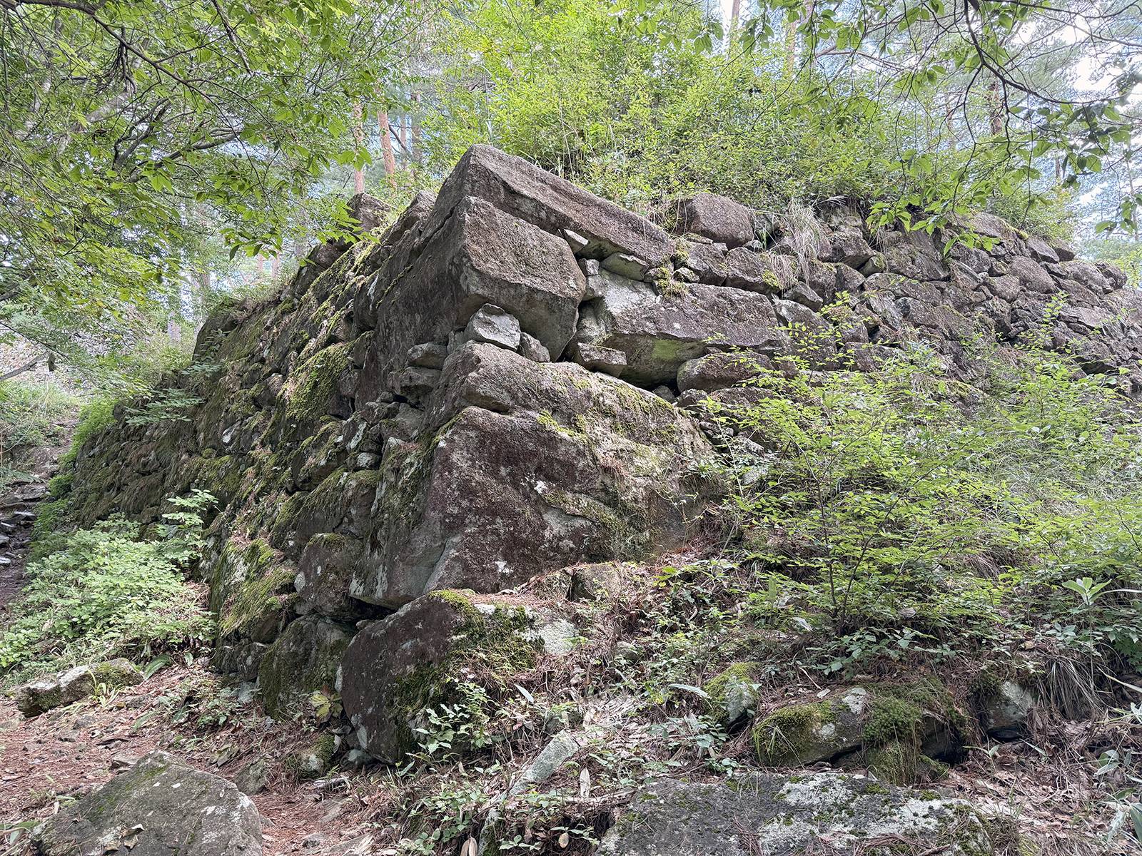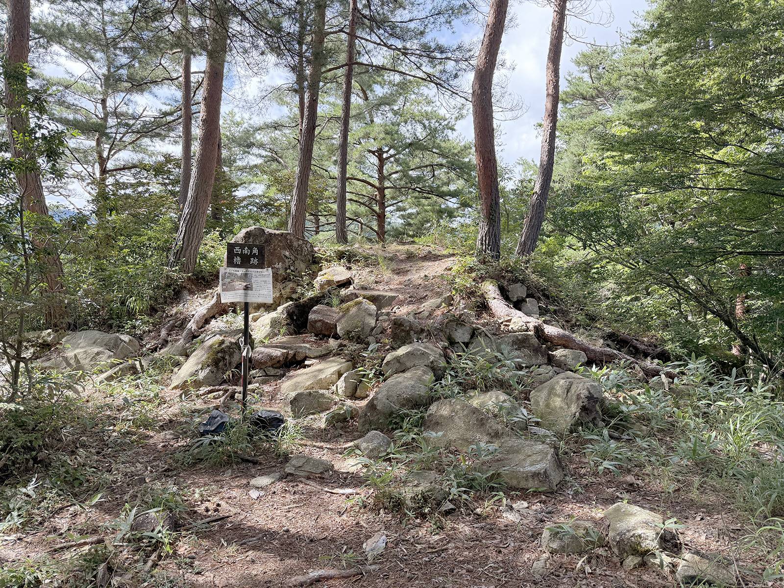日本列島のほぼ中央に位置する岐阜県高山市は、日本で最も大きい市域を持ち、東には槍ヶ岳、穂高岳、乗鞍岳などの飛騨山脈(北アルプス)が、西には別山など両白山地が聳える。高山市街地の南西に位置する松倉城跡は、標高856m、比高270mの松倉山の山頂を中心に築かれた戦国時代の山城跡である。松倉山は高山盆地周辺の山々に比べてひときわ高く、山頂からは高山盆地が一望できる。北は越中街道で越中国富山、南は尾張街道で美濃国岐阜、東は信濃街道で信濃国木曽、西は郡上街道で美濃国郡上へ至る交通の要衝であり、飛騨を統治する上での重要な拠点であった。最高所に本丸、東に二ノ丸、西から南に三ノ丸を設けた構造で、東・西・北東の3方向に尾根が伸び、これら尾根筋には小さな曲輪や堀切、竪堀が配置されている。城域は東西約300m、南北約240m、主郭部は東西約180m、南北約60mとさほど大規模な山城ではないが、主郭部は総石垣造りとなっており、高山城跡(高山市城山)の石垣が取り払われてしまっている現在、飛騨地方で随一となる石垣造りの城跡である。松倉城跡から尾根伝いに西に向けて登山道が整備されており、250mほどで松倉シンボル広場へ至る。この標高800mの松倉シンボル広場までは車で行くことができる。松倉城の本丸は、内曲輪と外曲輪の2段で構成されている。松倉城の中心となる内曲輪は約24m四方の方形で、天守の穴蔵(地階)のように周囲を石塁が囲んでいる。この内曲輪は、曲輪としては小規模なため天守台と考えられているが、発掘調査では建物の存在を示す礎石等は確認できなかった。しかし、後世に削平を受けている可能性も否定できない。一辺が24m前後となる天守台としては、播磨姫路城(兵庫県姫路市)の大天守(南辺約28m、東辺約20m)が近く、上には大型の5層天守が載っている。松倉山の山頂に5層天守は必要ないため、天守が存在したのであれば1層目を入母屋造の大屋根として望楼を載せた初期望楼型天守と考えられる。内曲輪の南辺の東寄りに出入口が開く。内曲輪の西側と南側にL字形の外曲輪が付属し、西辺32m、南辺38mを測る。外曲輪の東面石垣が途切れる箇所が出入口となり、石段は確認されておらず、形状から木製階段が存在したと想定される。本丸外曲輪の石垣が最も良好な残存状況で、高さ約8mの高石垣で隅角部(ぐうかくぶ)は算木積みになっている。本丸の東側に突き出る二ノ丸は、東西約40m、南北約20mの長方形の曲輪である。二ノ丸には大手門跡と井戸跡があり、南面には旗立岩という巨岩が存在する。この旗立岩の上部には亀裂があり、そこに旗を立てたという。二ノ丸の発掘調査では2時期の礎石建物跡が見つかっている。なお、織豊系城郭の特徴を示す瓦は未検出で、瓦葺建物は存在しなかったと考えられる。高山の地は寒冷地なので、瓦では内部の水分が凍結して割れてしまうため使用されず、柿葺(こけらぶき)など木材の板で葺かれたと考えられる。三ノ丸は本丸から南西方向へ延びる曲輪で、南側に出枡形虎口、西側に隅櫓、北側に埋門をもつ石塁が存在した。南面の石垣は、出枡形虎口のところから始まり約43mにおよぶ長大なものである。長方形の出枡形虎口は、東西約20m、南北約8mの規模で、北面の一部と西・南・東面を石垣で囲む。西側が出入口となるが、破城の際に三ノ丸と出枡形虎口の両側から石垣を崩しており、通路は大量の石材で塞がれている。現在は出枡形虎口からの通路は不明とされているが、赤色立体地図を拡大すると、松倉城南側の越後谷に向かうつづら折りの道が確認できるという。松倉城は吾神谷(わがかみだに)からの道が大手、西尾根からの道が搦手である。