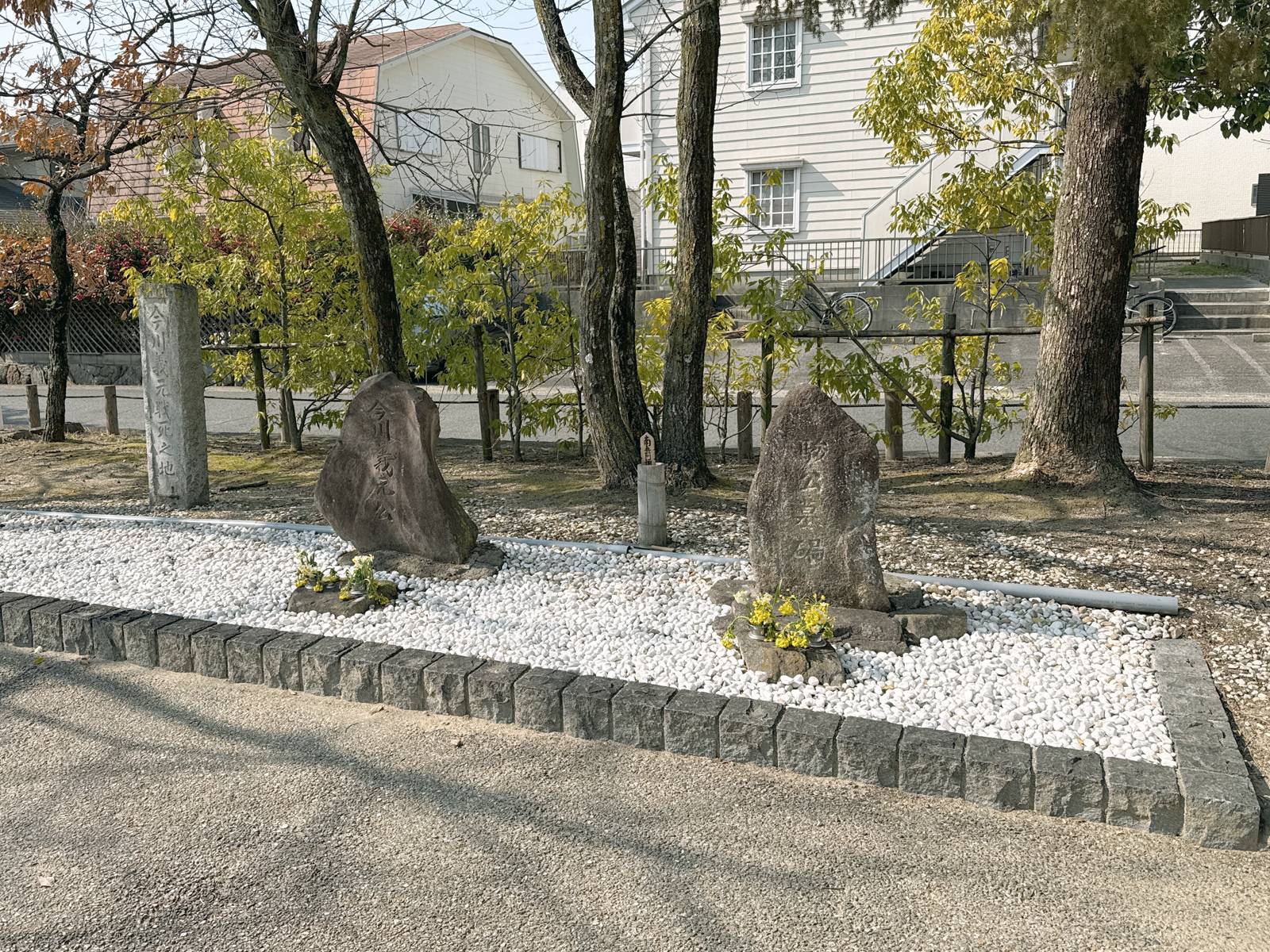 桶狭間合戦ゆかりの旧跡は広範囲に点在する。その理由は、信長が義元を討ち取った後、潰走する今川軍を追って、織田軍による大規模な追撃・掃討戦がおこなわれたためである。現在、桶狭間古戦場の候補地として、桶狭間の丘陵西麓の桶狭間古戦場公園(名古屋市緑区桶狭間北)と、丘陵北麓の桶狭間古戦場伝説地(豊明市栄町)が挙げられる。おそらく織田軍に急襲された今川軍はその両方に敗走したので、いずれも古戦場といえる。しかし、大高城に逃れようとした義元が討たれたのは、かつて田楽坪と呼ばれた西麓の古戦場と考えられる。義元は深田際まで追い込まれて討ち取られた。桶狭間古戦場公園には、田楽坪の「ねず塚」から出土した「駿公墓碣(すんこうぼけつ)」と刻まれた墓碑があり、義元のものとされる。田楽坪の東方にある丘陵中腹あたりは見晴らしがよく、今川軍の前衛部隊である松井宗信隊1500が布陣した高根山と幕山(まくやま)や、井伊直盛隊1100が布陣した巻山(まきやま)が一望でき、人馬に給する水や草にも恵まれて本陣を置くのにふさわしい。幕山は前衛部隊が陣幕を張ったことから名付けられ、巻山は義元の敗死後に井伊直盛隊が織田軍に取り巻かれる、つまり包囲されたことから名付けられたという。遠江二俣城主の松井左衛門宗信は高根山で戦死、井伊直盛は次郎法師こと女城主・井伊直虎(なおとら)の父で、巻山で戦死している。長福寺(名古屋市緑区桶狭間)は、桶狭間合戦後に信長が義元の首検証をおこなったという寺院で、境内には血刀濯ぎ(ちがたなすすぎ)の池もある。ここには『古戦場討死人別』という史料があり、桶狭間合戦での戦死者が記録されるが、この最後に「此外信長勢討死九百九十有余人、此内弐百七拾弐人ハ近江国佐々木方之加勢」とあり、織田軍の戦死者990余人のうち272人は近江国の佐々木方つまり六角氏の援軍とある。信長と六角承禎(じょうてい)は敵対していたイメージが強いが、この頃は同盟していたようである。永禄2年(1559年)信長は一時上洛しており、『言継卿記』には「尾州より織田上総介(信長)上洛と云々、五百計(ばかり)と云々、異形の者多しと云々」とある。500もの軍勢を引き連れた信長は、六角氏が支配する南近江をどのように通過したのかという問題が解決する。永禄3年(1560年)の『六角承禎条書写』でも六角氏が織田氏や越前朝倉氏と同盟していた事が分かる。この頃、織田氏と美濃斎藤氏の同盟は崩壊しており、今川氏が織田氏を攻める際、斎藤氏と連携するはずだが斎藤氏は動いていない。織田氏は六角氏や朝倉氏と連携して、斎藤氏を背後から牽制していた可能性もある。今川軍を掃討した信長は、全軍を釜ヶ谷に集めて勝鬨を上げた後、村人に戦死者を葬るよう命じて引き上げた。村人は山裾に約50mおきに7つの穴を一列に掘って埋葬し、これが七ツ塚(名古屋市緑区桶狭間北)と呼ばれるようになった。清洲城内で首実検がおこなわれたのは翌20日である。ずらりと並べられた首級は3千余にのぼった。この時、武将の名を特定するのに役立ったのが、捕虜となった義元の同朋(どうぼう)衆の林阿弥だった。この林阿弥に義元の首を持たせ、10人の僧を付けて駿河に送った。信長が桶狭間合戦で薄氷の勝利を得ると、役目を終えた善照寺砦は廃されたものと考えられる。熱田神宮の社殿の南東側に残る築地塀は「信長塀」と呼ばれ、永禄3年(1560年)信長が戦勝の御礼に寄進したものである。土と石灰を油で塗り固めて瓦を積み重ねた構造で、三十三間堂(京都府京都市)の太閤塀、西宮神社(兵庫県西宮市)の大練塀と並び、日本三大土塀のひとつに数えられる。(2026.02.16)